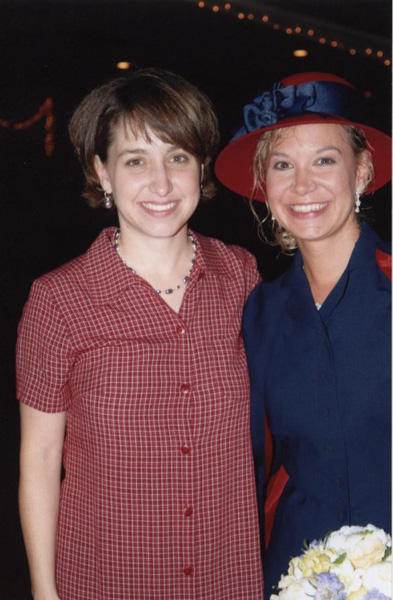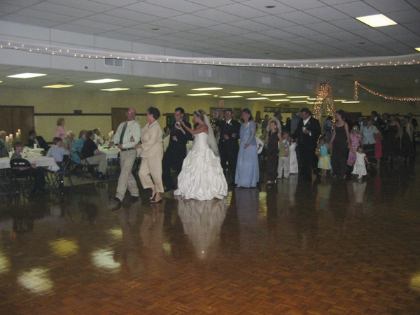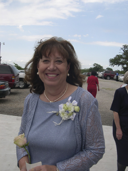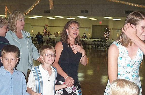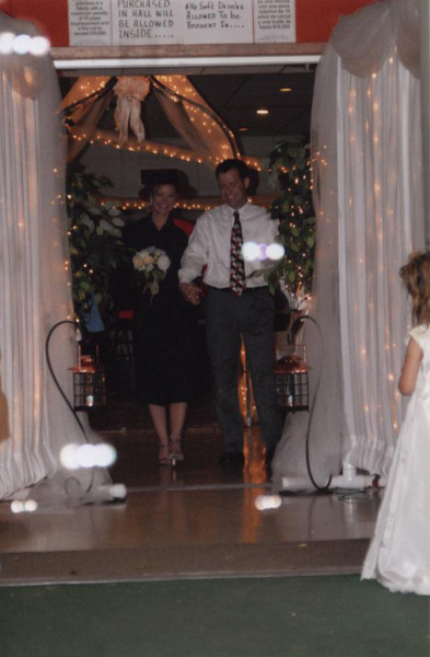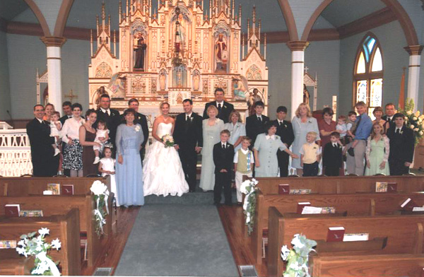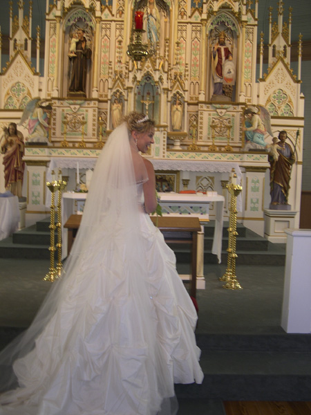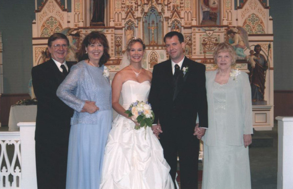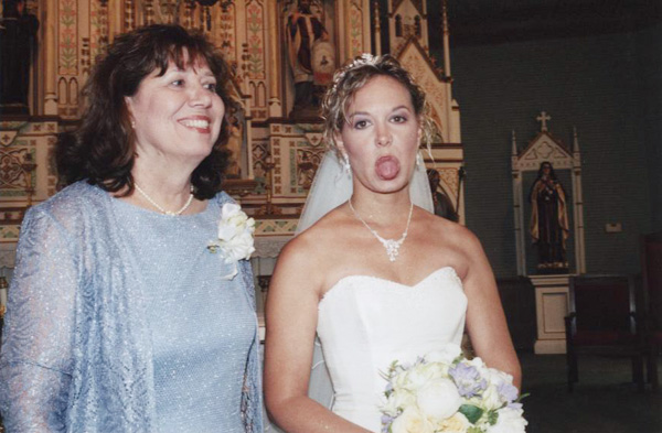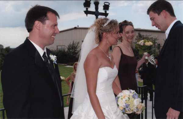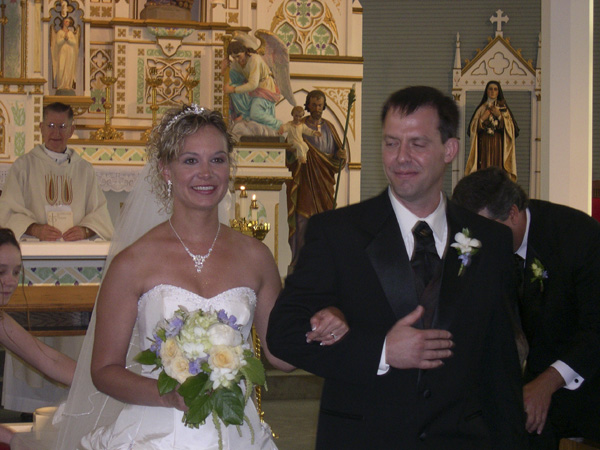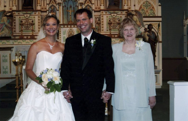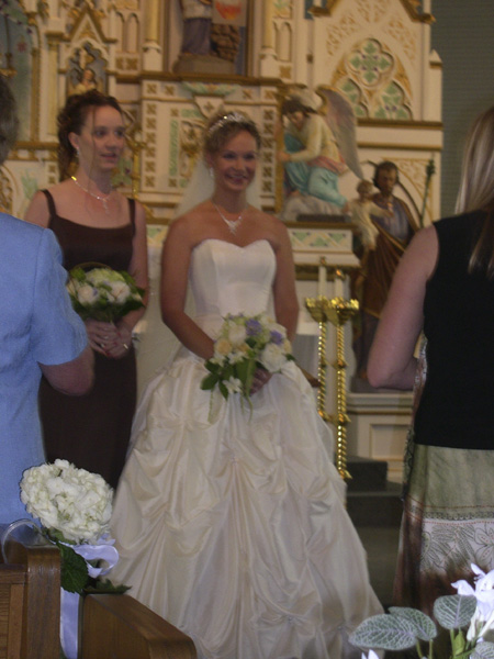 | Sister of the bride (Matron of honor), Sheri, poses with Paula before the ceremony. Paul waits with his groomsmen in the church hall next door. | Mother of the bride, Sharon Kuehn, escorted by the two brothers of the bride, Bruce (left) and Jeff (right) |
