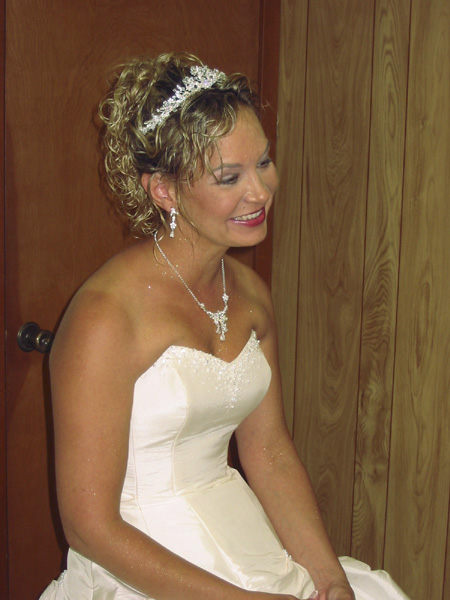 | Paula's family, friends and niece help her dress. | Dressed and waiting for her veil |