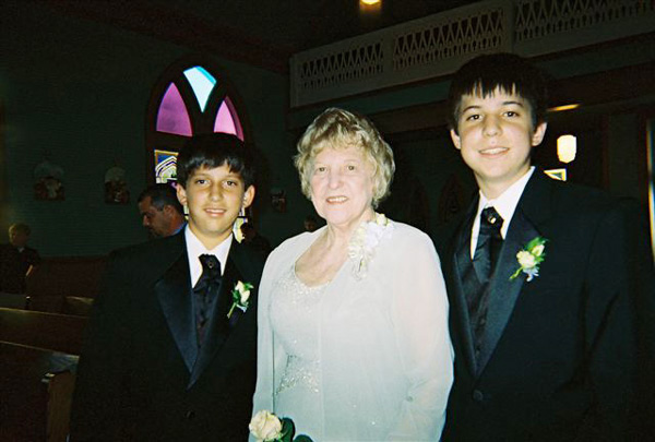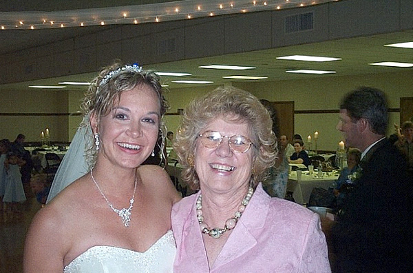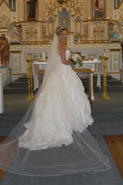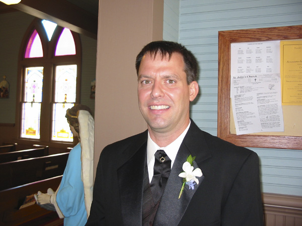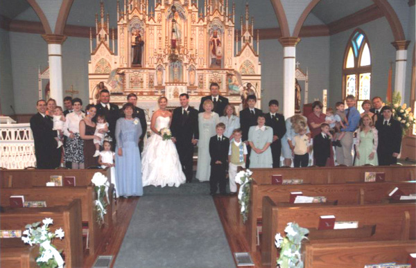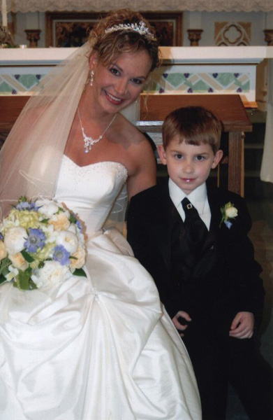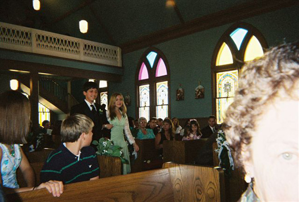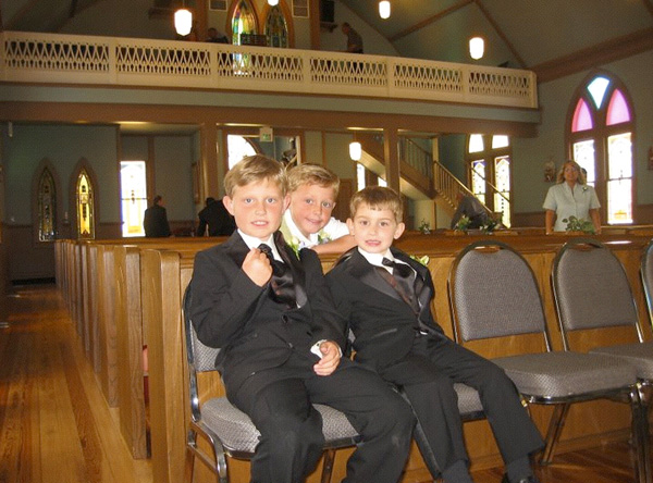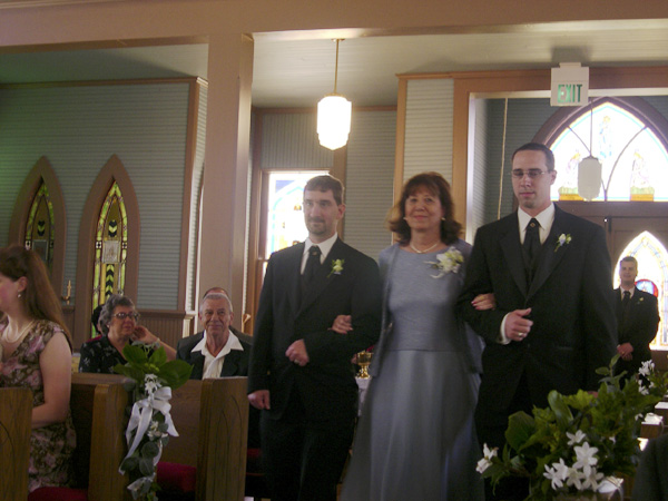 | Sister of the bride (Matron of honor), Sheri, poses with Paula before the ceremony. Paul waits with his groomsmen in the church hall next door. | Mother of the bride, Sharon Kuehn, escorted by the two brothers of the bride, Bruce (left) and Jeff (right) |