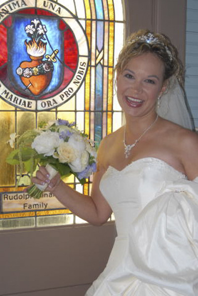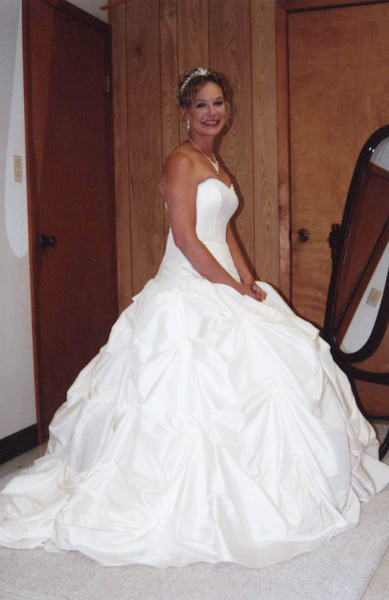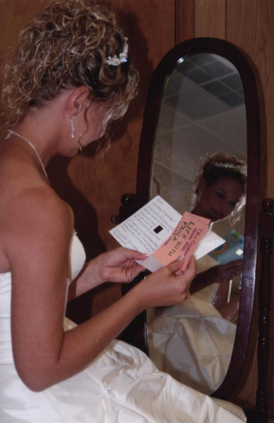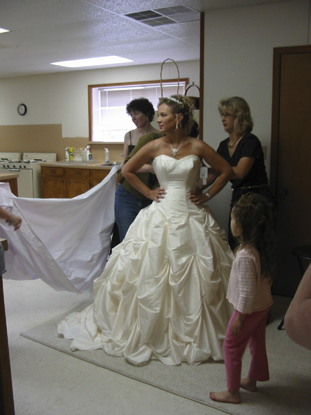 | Paula's family, friends and niece help her dress. | Dressed and waiting for her veil |